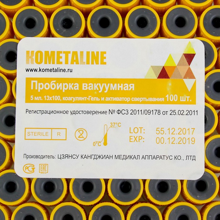 Пробирка вакуумная с коагулянтом-гелем и активатором свертывания, 5мл, 13х100, жёлтая