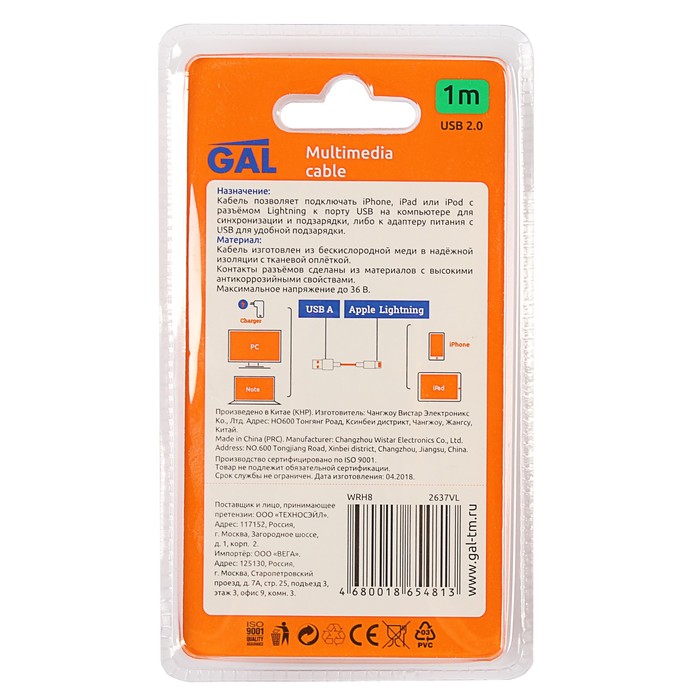 Провод для зарядки и передачи данных GAL 2637VL, USB-iPhone 5/6/7, 1м, плоский, фиолетовый