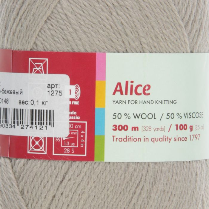 Пряжа "Алиса" 50% шерсть, 50% вискоза 300м/100гр (1275, серо-бежевый)