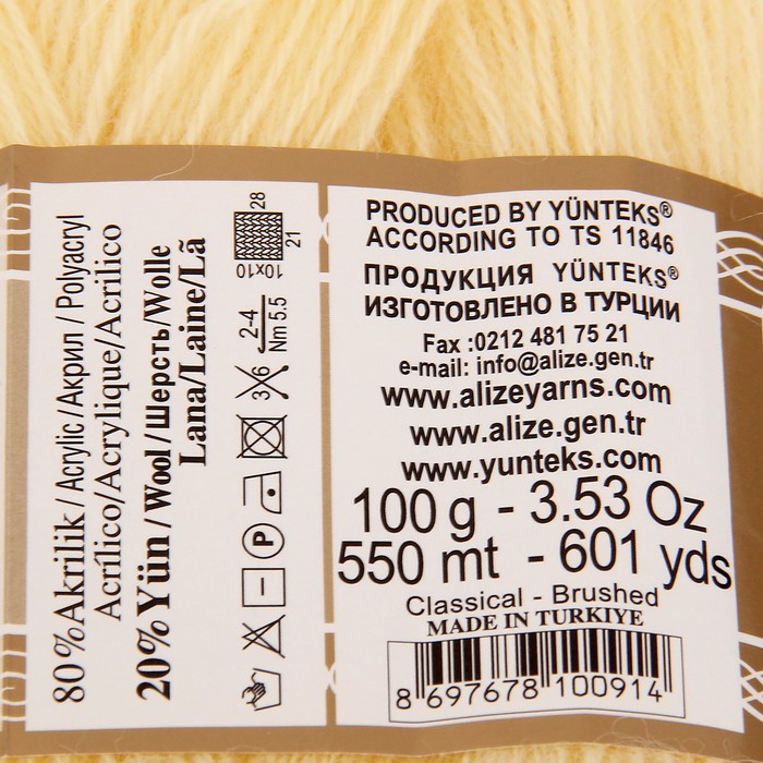 Пряжа "Angora Gold" 20% шерсть, 80% акрил 550м/100гр (219 св.лимон)