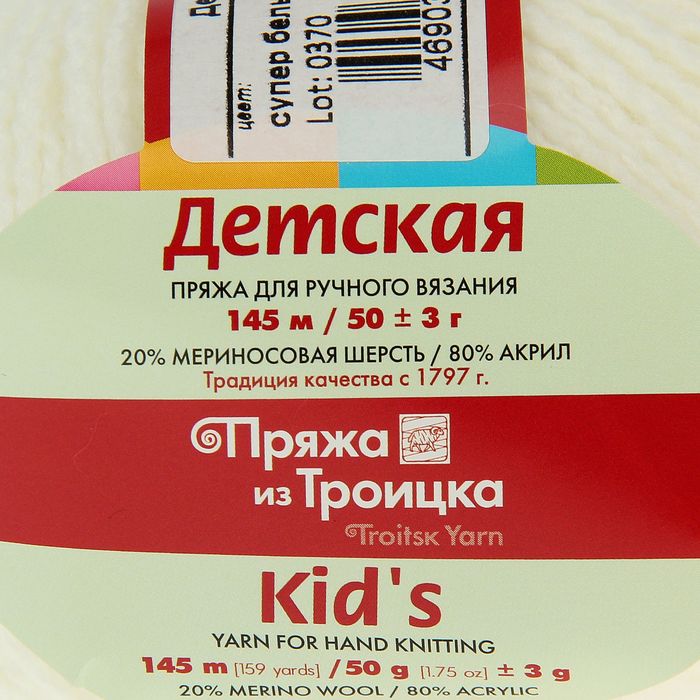 Пряжа "Детская" 20% меринос.шерсть, 80% акрил 145м/50гр (0235, супер белый)