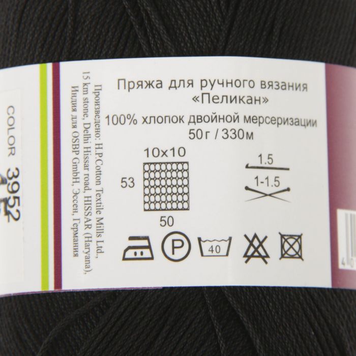 Пряжа "Pelican" 100% мерсеризованный хлопок 330м/50гр (3952 черный)