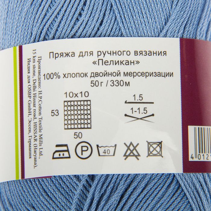 Пряжа "Pelican" 100% мерсеризованный хлопок 330м/50гр (3975 голубой)
