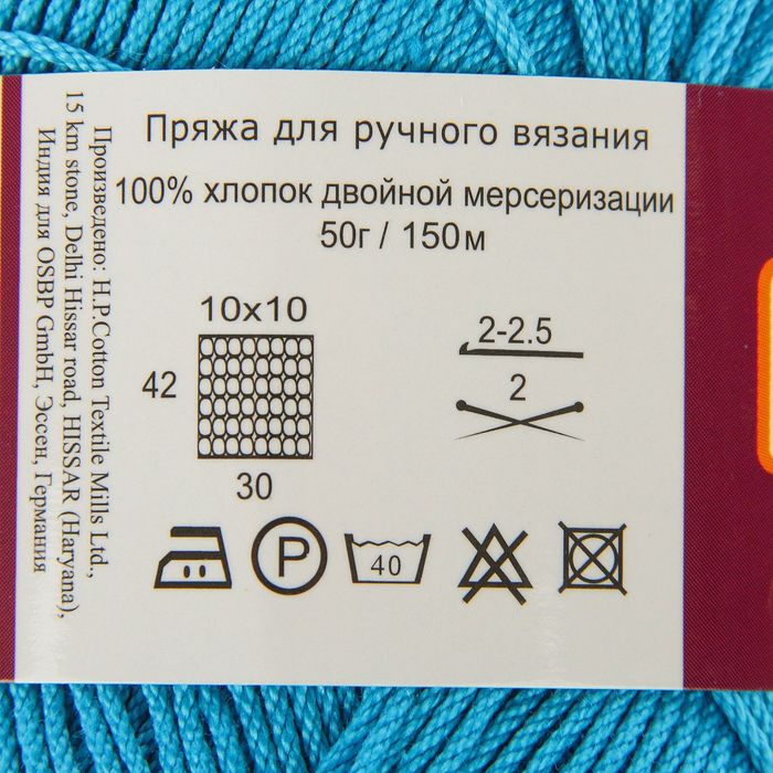 Пряжа "Rosе" 100% мерсеризованный хлопок 150м/50гр (3937 голубая бирюза)