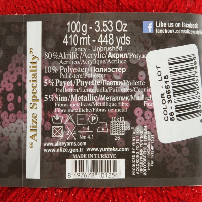 Пряжа "Sal abiye" 80% акрил, 10% полиэстер, 5% метал., 5% пайетки 410м/100гр (56 красный)