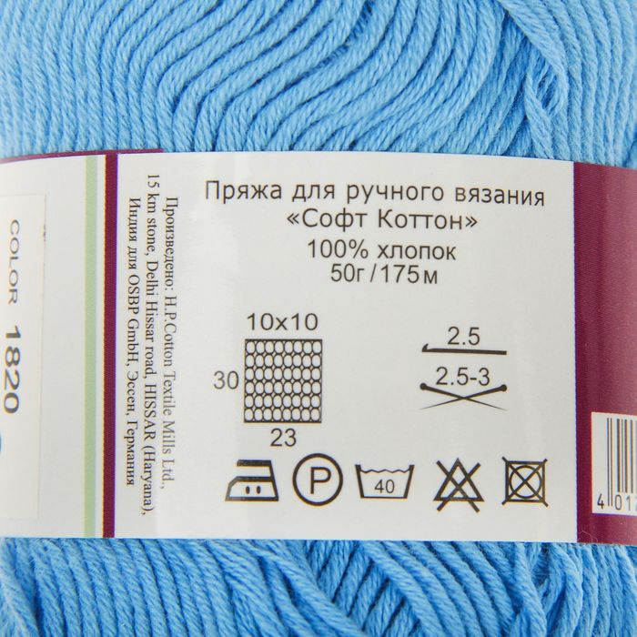Пряжа "Soft cotton" 100% хлопок 175м/50гр (1820 голубой)