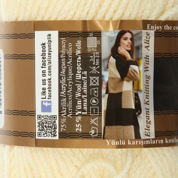 Пряжа "Superlana Zincir" 25% шерсть, 75% акрил 280м/100гр (01 кремовый)
