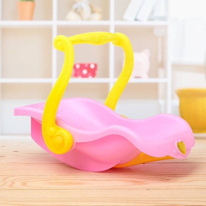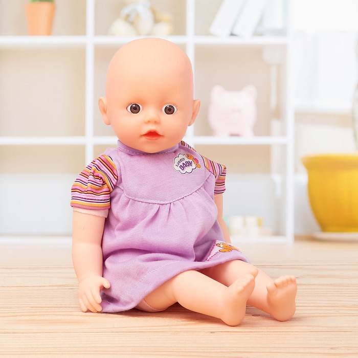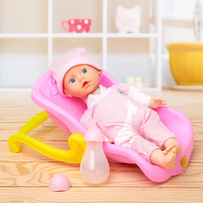 В комплекте с пупсом есть музыкальная переноска. Она умеет качаться, а также воспроизводит мелодии и светится. У куклы двигаются руки, ноги и голова. Пупса можно кормить из бутылочки.