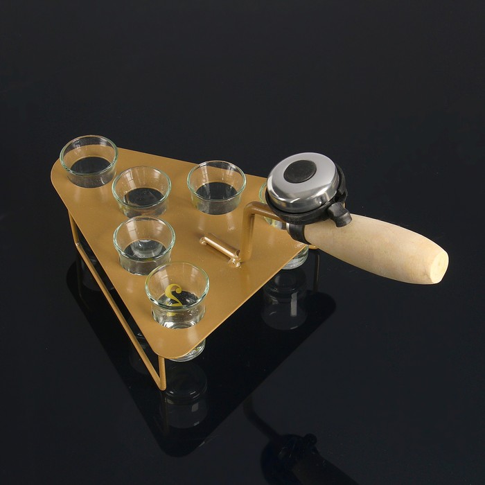 Перед нами – поднос-подставка для рюмок в форме «бронзового» строительного мастерка. На ручке – звонок, чтобы собутыльники уж точно не пропустили прибытие любимого напитка. В комплект также входит 6 рюмок и игровые кубики, чтобы в ожидании добавки можно было развлечься застольно-настольными играми.