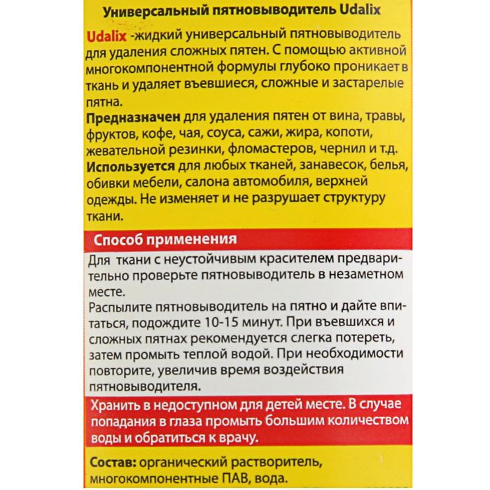 Жидкий пятновыводитель Udalix Ultra удаляет трудновыводимые пятна от шариковых ручек, вина, травы фруктов, кофе, чая, соуса, сажи, жира, копоти, жевательной резинки, фломастеров, чернил . Его можно использовать для любых видов тканей, занавесок, белья, обивки мебели, салона автомобиля, верхней одежды.