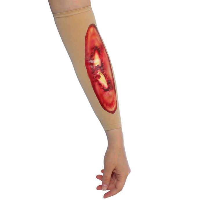 Реалистичная рана с 3D-эффектом легко надевается на руку и выглядит впечатляюще. Косточки, якобы торчащие из вашей конечности, напугают всех вокруг и станут предметом для розыгрыша в обычный день. И не забудьте вооружиться видеокамерой: поверьте, реакция ваших друзей, а в особенности подруг, будет весьма бурной.