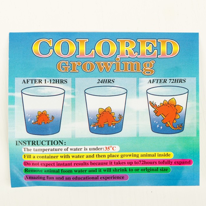 Фигурки, которые увеличиваются при погружении в воду, любопытны и забавны. В процессе игры ребёнок в простой форме узнает о свойствах воды и понаблюдает за ростом существа. Такие игрушки интересны маленьким исследователям как эксперимент, ведь это настоящее чудо, когда фигурки увеличиваются в объёме в несколько раз!