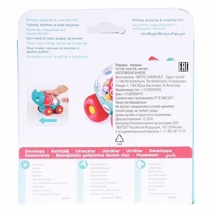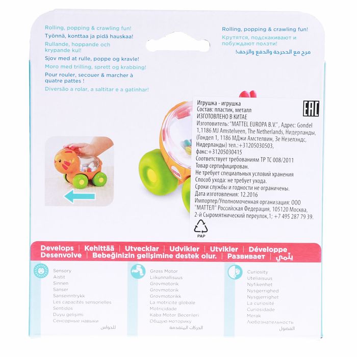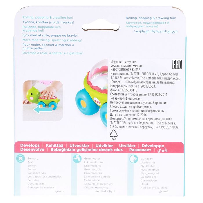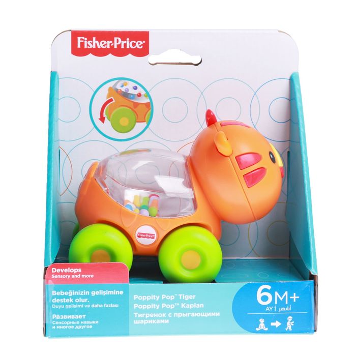 Зверята Fisher Price имеют заводной механизм: когда игрушка едет, внутри неё гремят небольшие шарики. В коллекции представлена черепашка, бегемотик, тигрёнок и слонёнок. Игрушки подходят для самых маленьких, развивают мелкую моторику, навыки мышления и цветовое восприятие.