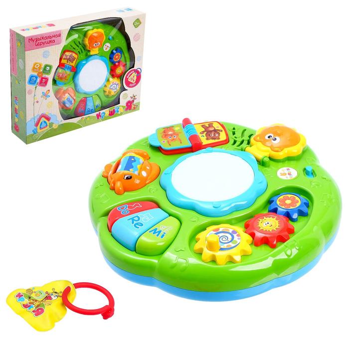 Световые и звуковые эффекты добавят увлекательности игре. Клавиши до, ре, ми воспроизводят соответствующие этим нотам звуки, а шестерёнки проигрывают зажигательные мелодии. Карапузу понравится стучать в барабан, листать музыкальную книжку, смотреться в зеркало, слушать животных и изучать время суток, вращая ролик на рыбке.