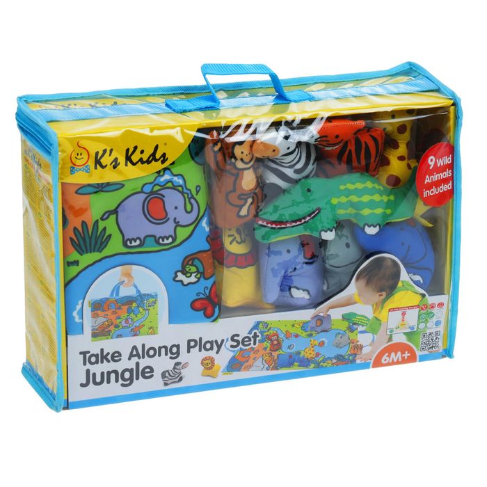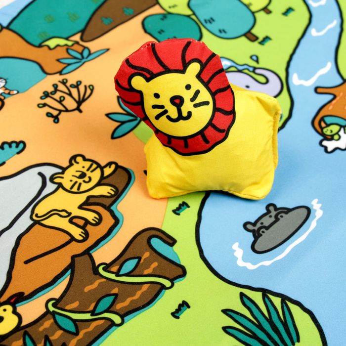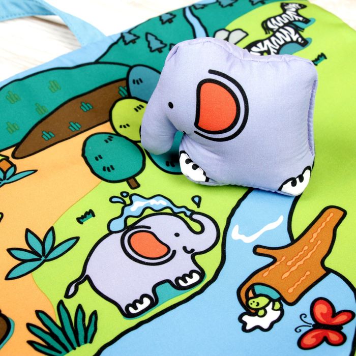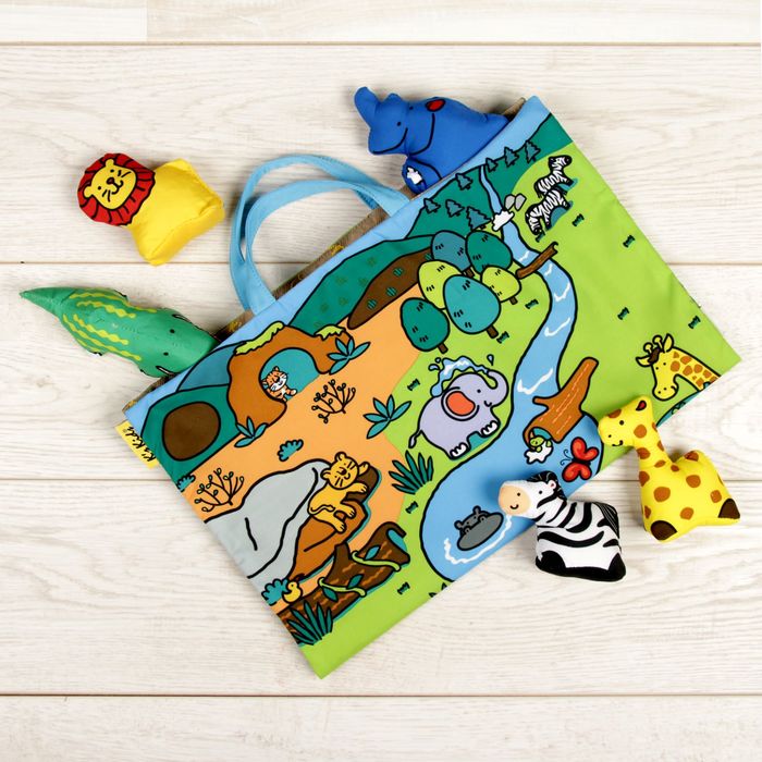 Развивающий набор состоит из красочного коврика и комплекта мягких игрушек. Рисунок на матрасике изображает места обитания разных животных.