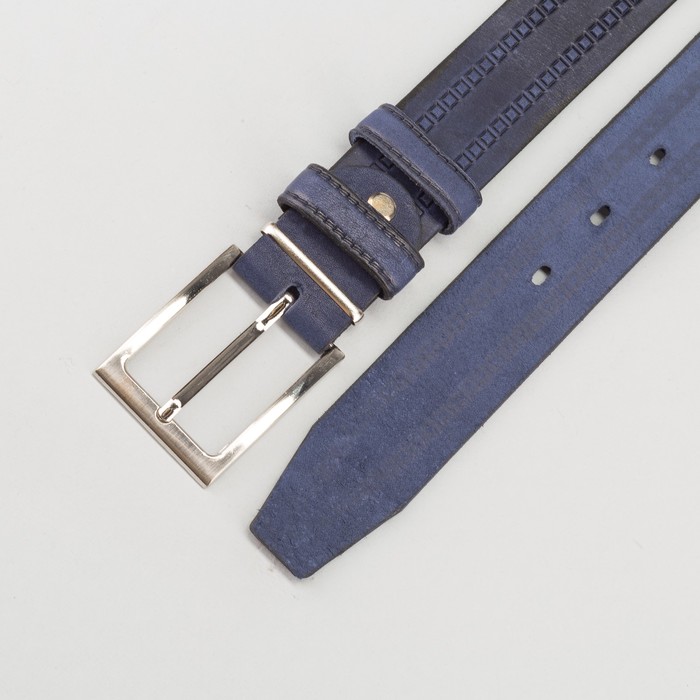 Ремень мужской, пряжка металл, ширина - 3,5 см, цвет синий — выбор стильных людей. Вещь изготовлена из качественных и безопасных материалов, а над дизайном работала команда настоящих профессионалов.