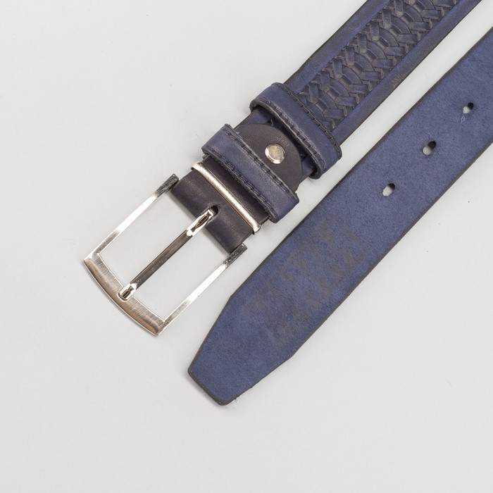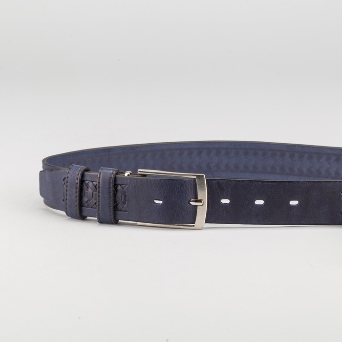 Ремень мужской, пряжка металл, ширина - 3,5 см, цвет синий — выбор стильных людей. Вещь изготовлена из качественных и безопасных материалов, а над дизайном работала команда настоящих профессионалов.