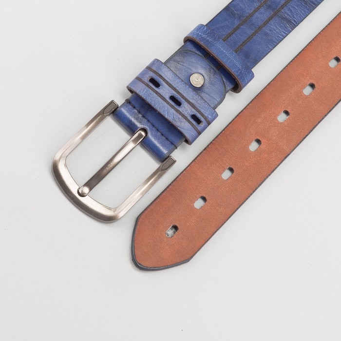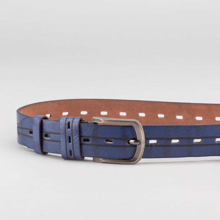 Ремень мужской, пряжка тёмный металл, ширина - 4 см, цвет синий — выбор стильных людей. Вещь изготовлена из качественных и безопасных материалов, а над дизайном работала команда настоящих профессионалов.