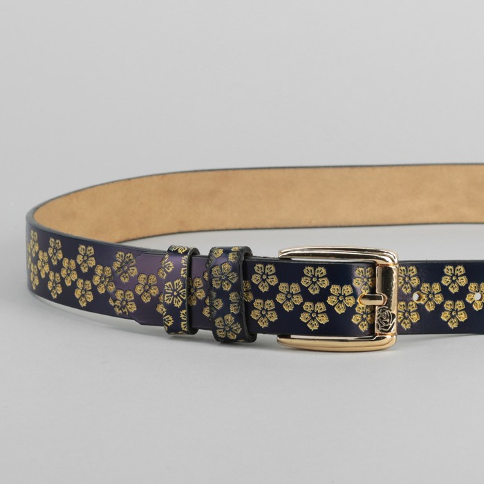 Ремень женский, цветы, перфорация, пряжка золото, цвет синий