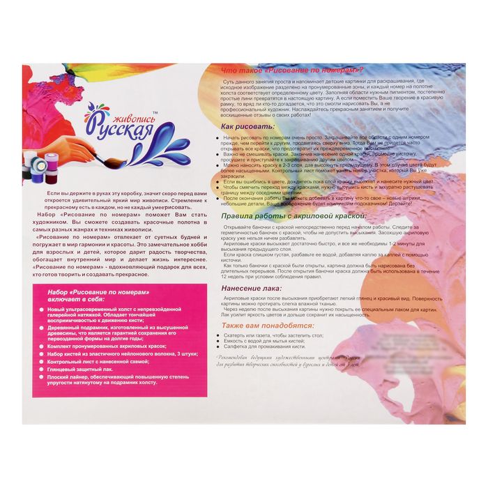 Набор для росписи по номерам позволит любому желающему приобщиться к искусству живописи. А готовый шедевр станет эффектным украшением интерьера или отличным подарком ценителю прекрасного.