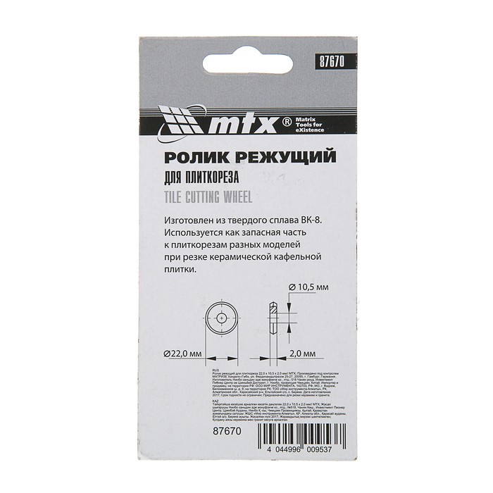 Ролик режущий для плиткореза MATRIX, 22х10.5х2 мм