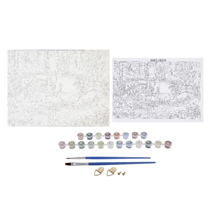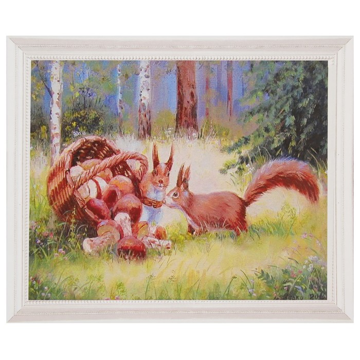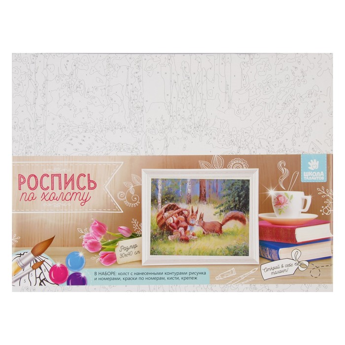 Роспись по холсту "Белочки с грибами" по номерам с краск по 3 мл+ кисти+инстр+крепеж 30*40
