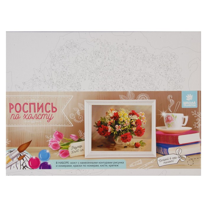Роспись по холсту "Кучерявый букет" по номерам с красками по 3 мл+ кисти+инстр+крепеж 30*40