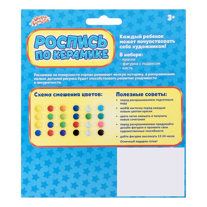 Может быть, именно такой необычный товар, как Роспись по керамике "Цветочек с подвесом" + краски 3 цвета по 3 г, кисть, раскроет неожиданные способности у вашего ребёнка. И даже если он не станет новым Рафаэлем, то ему, определённо, обеспечена богатая фантазия, креативное мышление и золотые руки.