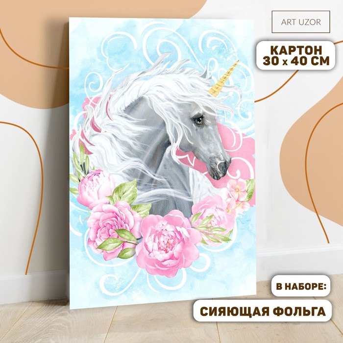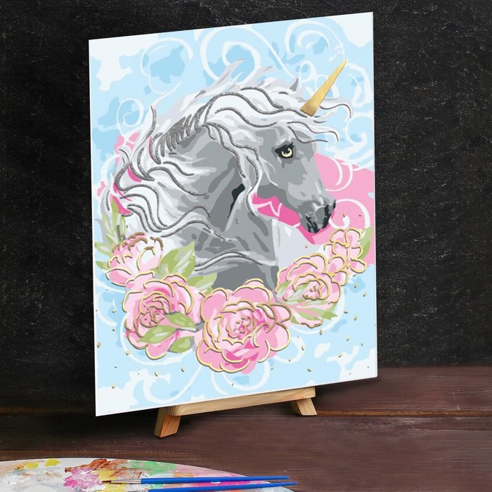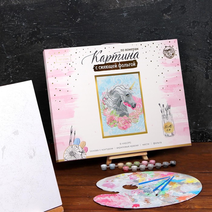 Роспись по номерам "Единорог" с фольгой, краски 14 шт, кисти, крепления