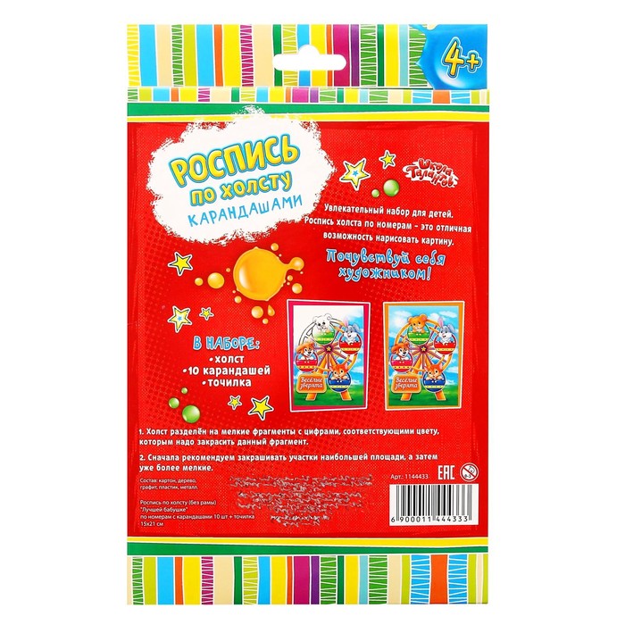 На основу с эффектом холста уже нанесён контур рисунка, маленькому художнику остаётся только взять карандаши из комплекта и создать удивительный шедевр. Поставьте готовую картину на видное место, чтобы все смогли оценить мастерство и творческий подход юного дарования!