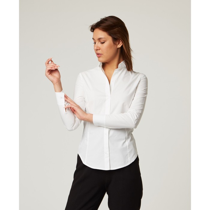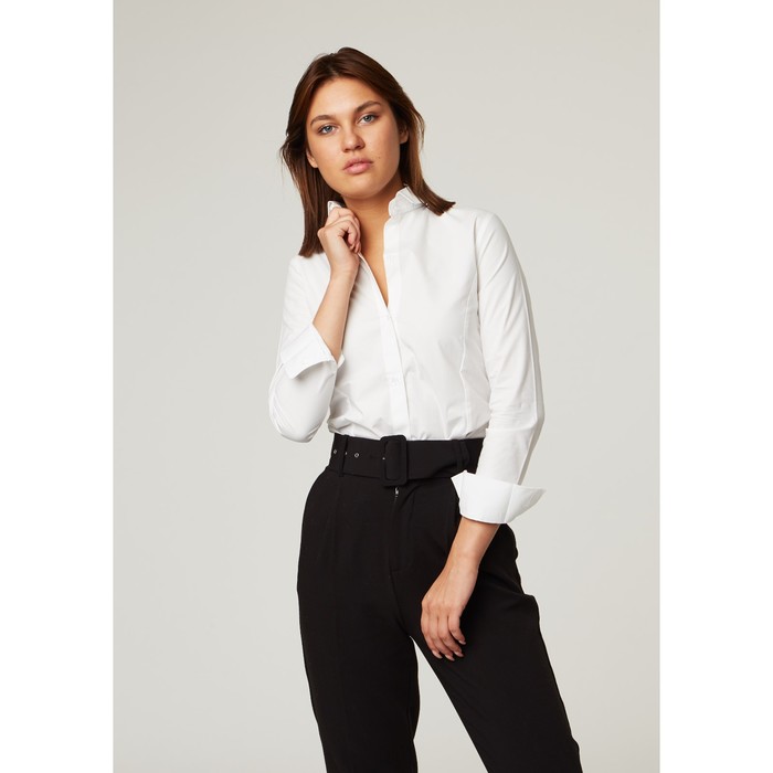 Блузка с длинным рукавом, приталенным силуэтом и практически невидимыми пуговицами сшита из натурального стопроцентного хлопка.