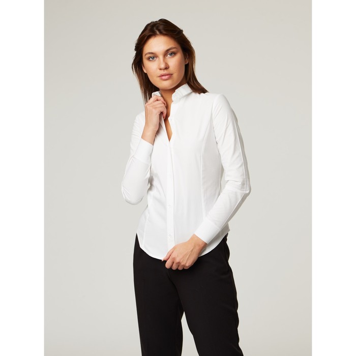 Блузка с длинным рукавом, приталенным силуэтом и практически невидимыми пуговицами сшита из натурального стопроцентного хлопка.