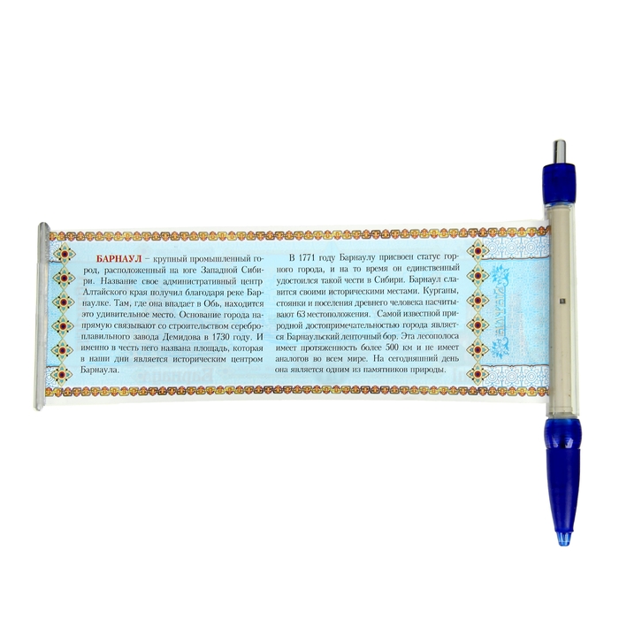 Ручка-флажок «Барнаул» — оригинальный и полезный подарок с авторским дизайном для ваших друзей, родных или коллег. Она станет незаменимым помощником в работе и личной жизни, а её стильный внешний вид будет радовать владельца день за днём. Её пластиковый корпус дополнен разворачивающейся бумажной вставкой с коллажем из достопримечательностей города. Другая сторона флажка рассказывает о Барнауле.