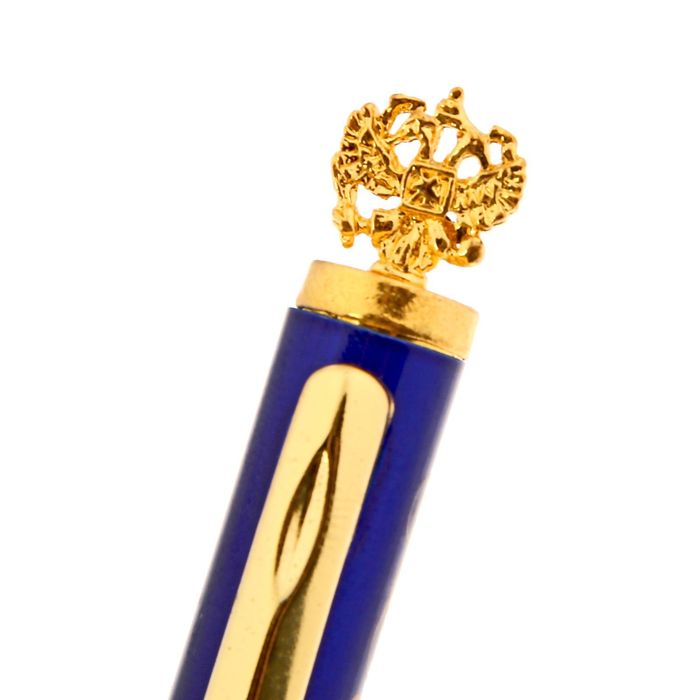 Лакированный металлический корпус синего цвета украшен фигурным наконечником в форме герба. Стержень подаётся посредством механизма поворотного действия.