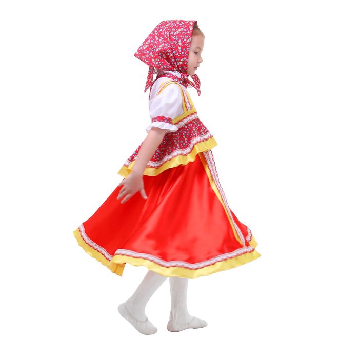 Русский народный костюм "Алёнушка", платье-сарафан, косынка, р-р 64, рост 122-128, цвет красный превратит вашу дочку в настоящую славянскую красавицу! Такой образ — это возможность с головой окунуться в атмосферу народных сказок и сыграть на сцене театра.