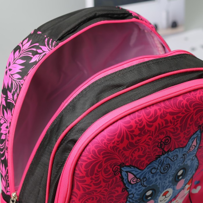Рюкзак школ Котенок, 29*15*40, 2 отд на молниях, 2 бок сетки, усилен спинка, черный/розовый