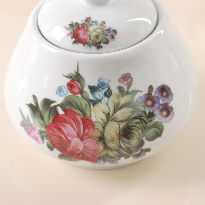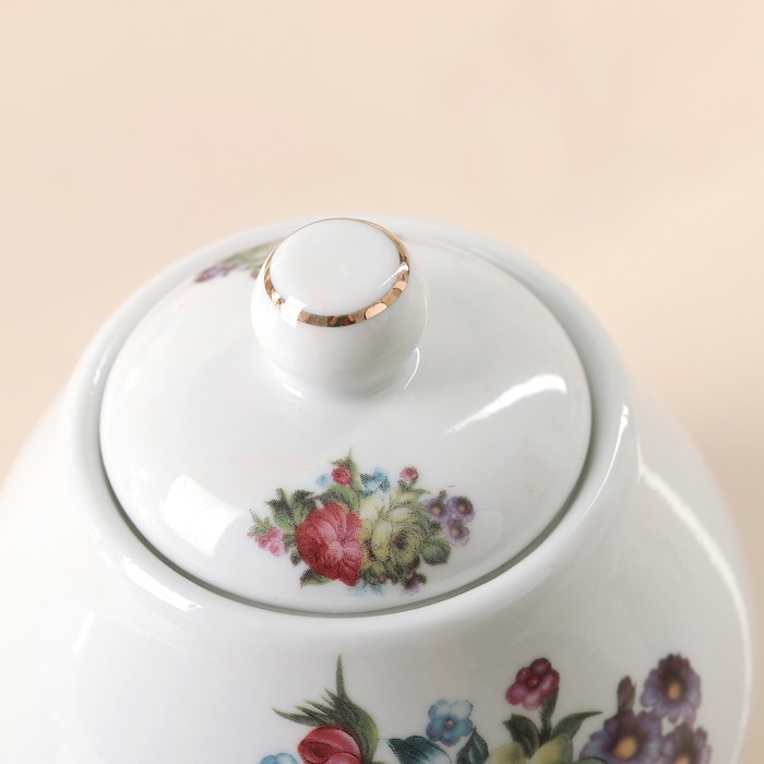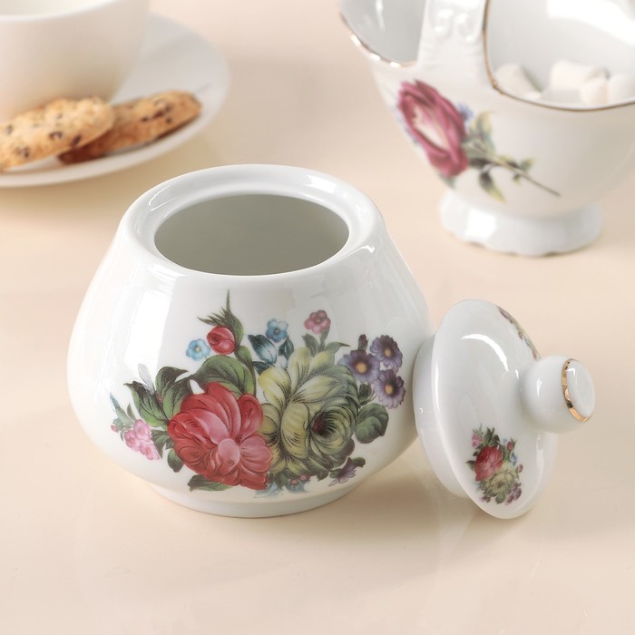 Сахарница поможет оформить стол для пышных торжеств. Предмет изготовлен из качественной тонкостенной керамики. Нежно-белая поверхность придётся по душе ценителям классики. Яркий рисунок отличается тщательностью проработки. Элегантный штрих — кайма насыщенного золотого цвета.