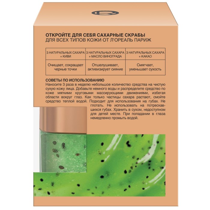 Используйте Сахарный скраб L'Oreal для лица 3 натуральных сахара и Киви, очищающий, сокращающий черные точки, 50 мл для регулярного ухода. Средство содержит особые компоненты, которые удаляют отмершие клетки, устраняют неровности и шероховатости с поверхности лица, делают его гладким и ухоженным.