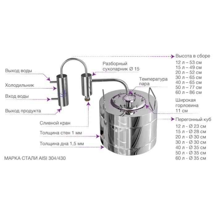 Самогонный аппарат "Мечта" 20 л, сухопарник + термометр + ТЭН
