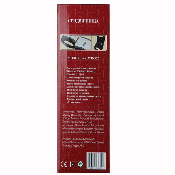 Сэндвичница Winner WR-362, 750 Вт, на 2 порции, антипригарное покрытие