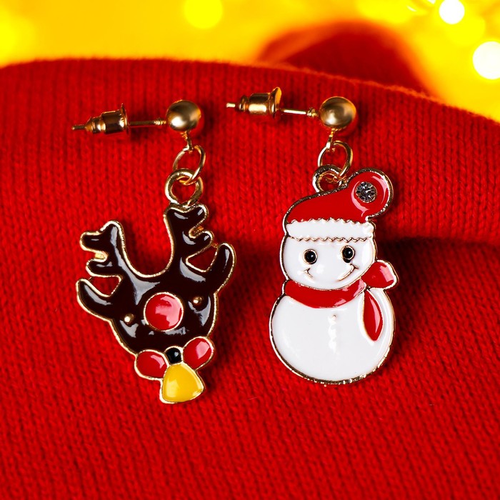 Серьги "Новогодние" олень и снеговик, цветные в золоте