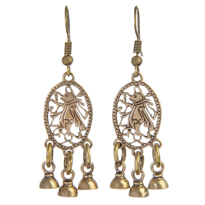 Изделие с данной птицей приносит владелице счастье, удачу, успех и немалое богатство. А шумящие колокольчики на серьгах отгоняют злых духов.