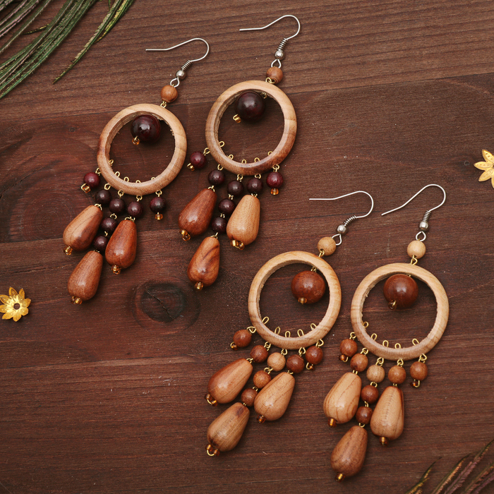 Серьги ручная работа, деревянные "Кольца с капельками", цвет коричневый