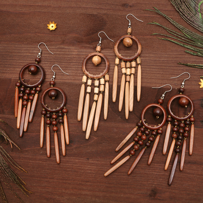 Серьги ручная работа, деревянные "Кольцо 5 палочек без янтаря", цвет светло-коричневый