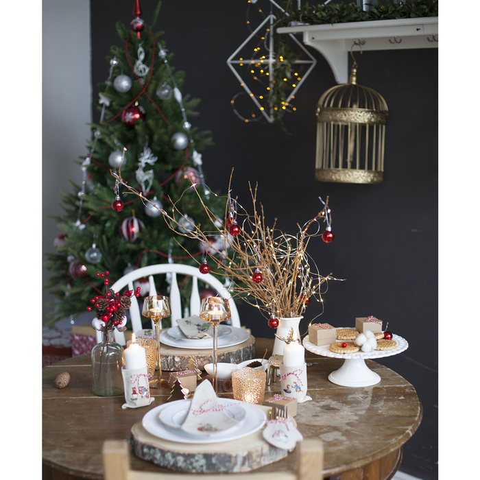 Помочь маме украсить стол особенно будут рады дети, ведь на каждой салфеточке свой новогодний сюжет! Так весело придумывать, кому из членов семьи достанется определённая картинка. А при оформлении подсвечников и чехольчиков для приборов будет очень полезно потренироваться в умении завязывать бантики из шнурков.