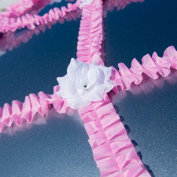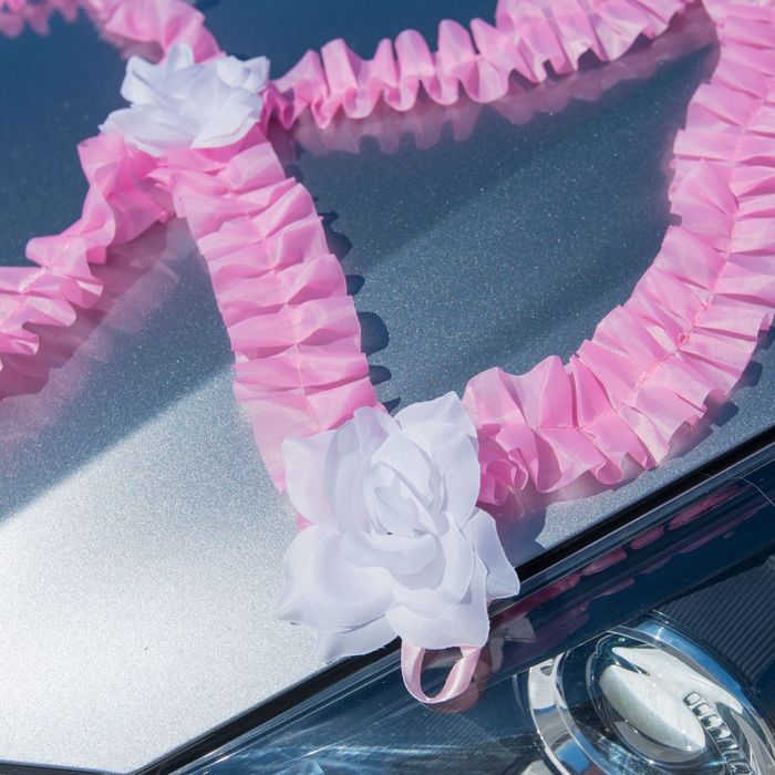 Основное внимание прохожих на улице должна приковывать именно машина, в которой едут молодожены. Сетка-рюш на капот "Нарядная" с цветами, цвет розово-белый главный опознавательный знак. Сделайте же свадебный транспорт самым ярким. Помните, среди множества украшений самыми популярными остаются ленты и цветы.