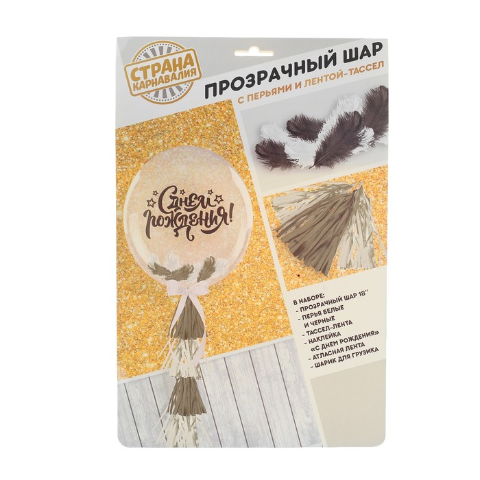 Шар полимерный 18" с тассел-лентой "Черно-белая лёгкость", перья