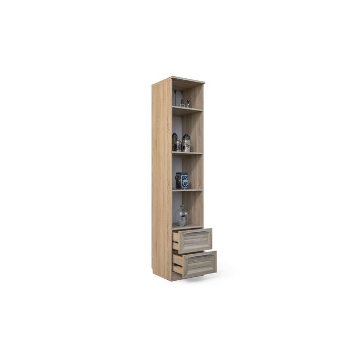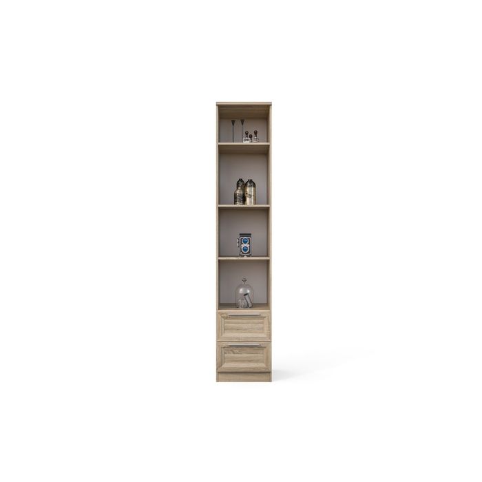 Шкаф имеет 4 открытых полки и 2 комодных ящика. Дополнительно можно приобрести ещё комплект полок шириной 418 мм или штангу.