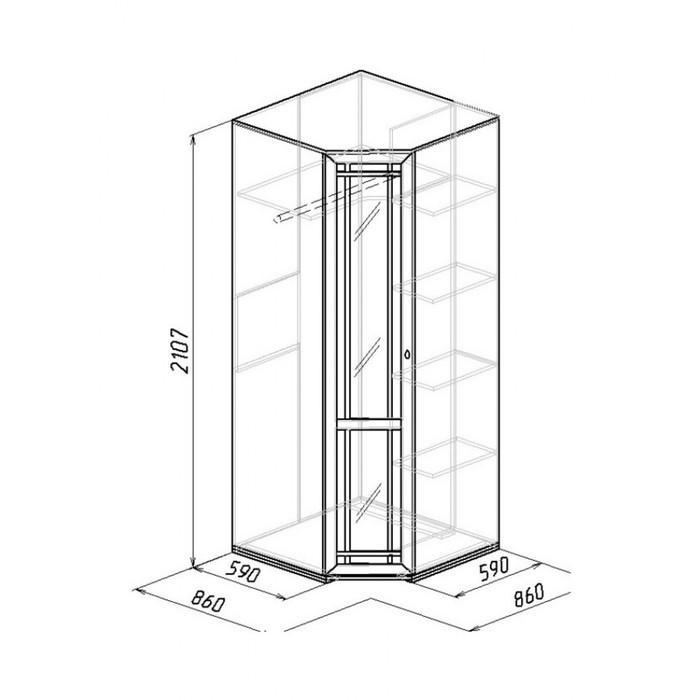 Шкаф оснащён несъёмной штангой длиной 81 см, полками для белья и автоматической подсветкой, которая включается при открытии дверей. Изготавливается только с левым фасадом (определяется по расположению петель). По габаритам подходит для модулей глубиной 590 мм. Рядом можно установить угловую полку.