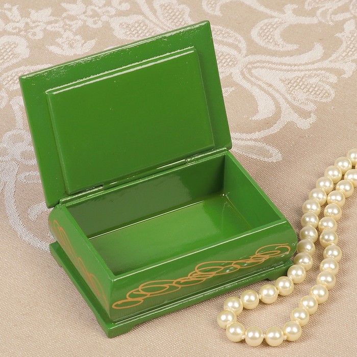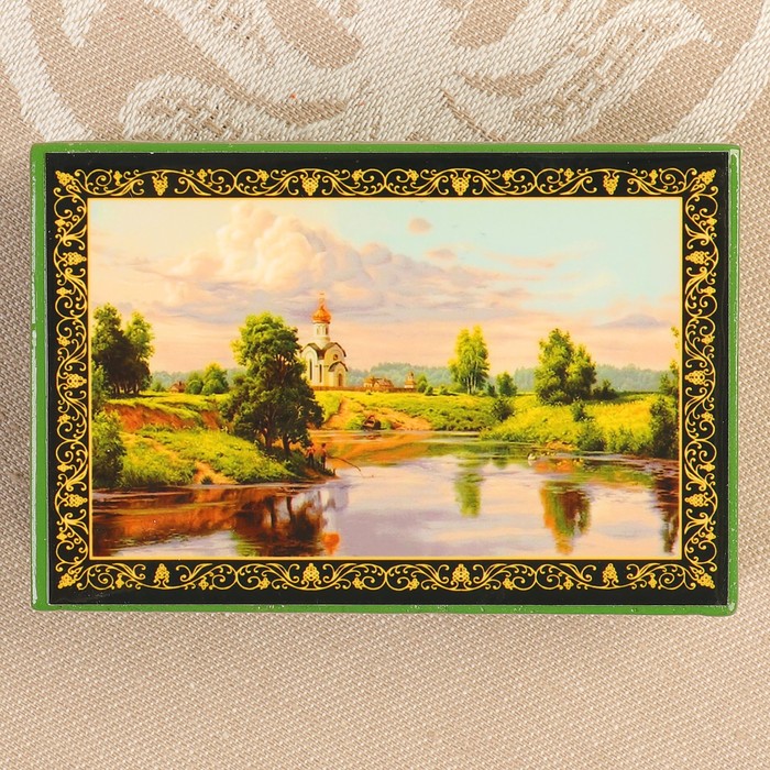 Шкатулка «Храм у реки», зелёная, 6×9 см, лаковая миниатюра